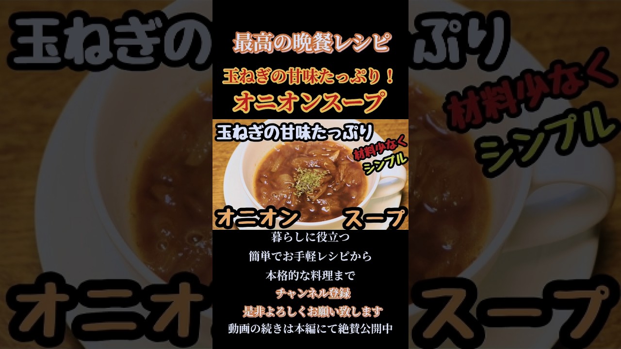 | タイトル | 【オニオンスープ】玉ねぎの甘味たっぷり!材料少なく簡単シンプルレシピ!#オニオンスープ#玉ねぎ#onion#onionsoup#shorts#shortsfood |